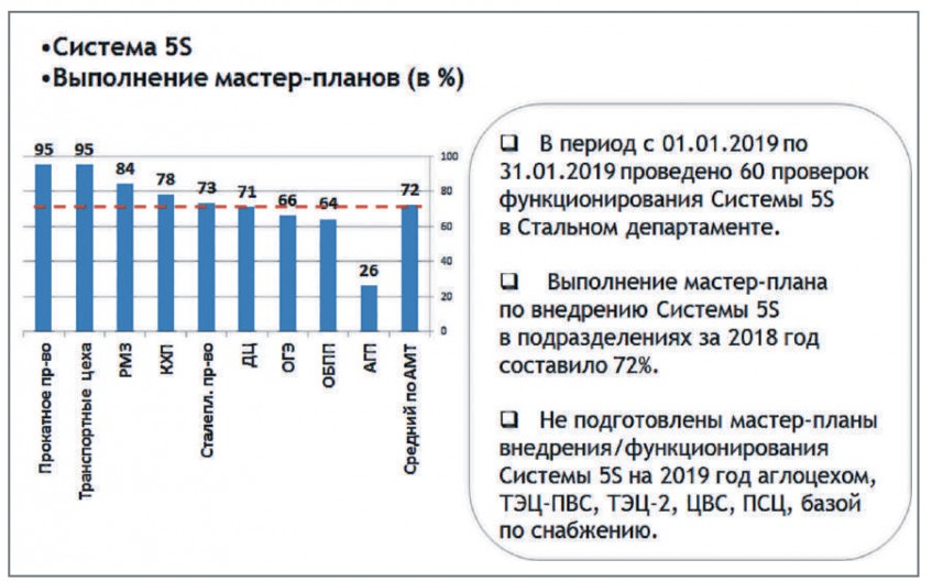 В подразделениях Стального департамента АО «АрселорМиттал Темиртау» продолжается внедрение Системы 5S, являющейся фундаментом методологии «Производство мирового класса» (WCM). Средний показатель выполнения мастер-плана по внедрению Системы в подразделениях за 2018 год составил 72%.